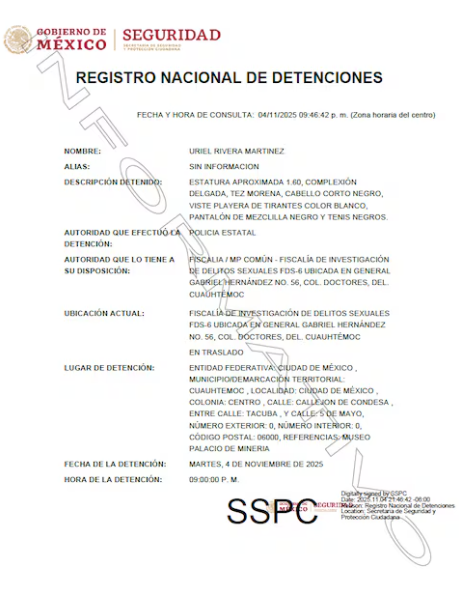 También se dio a conocer que el hombre está a disposición del Ministerio Público y se encuentra en la Fiscalía de Investigación de Delitos Sexuales en la colonia Doctores, alcaldía Cuauhtémoc.