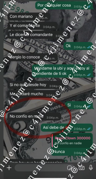 La preocupación de su pareja quedó reflejada en mensajes pidiendo que le compartiera la ubicación en tiempo real y se mantuviera solamente en sitios públicos. Regio Clown respondió: “No confío en nadie, pero hay que hacer negocios”. Además, envió el contacto denominado “Mariano Escolta”, explicando que se trataba de un trabajador del comandante y conocido de Sergio. El DJ reiteró: “Solo lugares públicos, amor, obvio”.